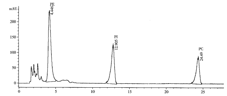分别制备不同浓度的磷脂工作标准溶液,其中磷脂酰胆碱的工作标准溶液质量浓度为50 ug/ mL,250 ug/ mL,800 ug/mL,1 000 ug/mL和4 000 ug/mL;磷脂酰乙醇胺的工作标准溶液质量浓度为100 ug/mL,250 ug/mL,800 ug/mL,1 000 ug/ mL和4 000 ug/mL;磷脂酰肌醇的工作标准溶液质量浓度为150 ug/mL、250 ug/mL,800 ug/ mL、1 000 ug/ mL和4 000 ug/mL。 待流速和柱温稳定后,准确吸取10 uL磷脂标准工作溶液注射入HPLC,在相同的色谱条件下注射10 uL测试液。测试液以峰面积定量。由色谱峰的峰面积可从标准曲线上求出相应的磷脂的浓度。