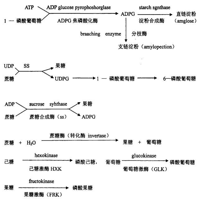 蔗糖合成酶是由分子量约为 83KD-100KD 的亚基构成的四聚体, 大多数植物中至少有两种SS 的同工酶。可溶性的 SS 存在于细胞质中, 不溶性的 SS 附着在细胞膜上, SS 同工酶在基因调控上有明显不同, 基因表达有发育和器官的特异性。SS 的基因表达和酶定位受培养液中糖的调节。低糖水平下主要有利于 SS 在根的外周细胞中积累, 高糖水平下, SS 在所有细胞中表达加强。SS 催化: 果糖 + UDPG= 蔗糖+ UDP。SS 催化蔗糖合成又可催化蔗糖分解, 蔗糖合成最适 PH 值 8. 0-9. 5, 分解最适 PH 值 5. 5-6. 5。但通常认为 SS 主要起分解蔗糖作用。SS 调节淀粉合成, SS 调节 UDPG 产生, UDPG 在 UGPase 作用下, 生成 1-磷酸葡萄糖, 再在 AGPase 作用下生成 ADPG, 从而合成淀粉。