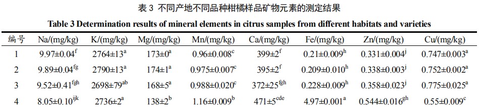 三种不同品种柑橘样品的 Na、K、Mg、Mn、Ca、Fe、Zn、Cu 8 种矿物元素检测结果见表 3,从表 3 中可以看出三个柑橘品种的 8 种元素含量均有差异,但三个柑橘品种样品中常量元素钾的含量最高,占 8 种元素总含量的 60%以上,其次为钙、镁,钠,钠为常量元素中含量最低的元素,这与李云仙等人的研究结果相一致。微量元素中 Mn 的含量最高,Fe 元素含量相对较低。三个不同品种柑橘其矿物元素的含量比例具有同一性。从表 3 中可以看出,除 Na 元素外,其它元素不同品种之间差异显著,且比同品种间不同产地来源样品的差异大,这说明品种自身特性是造成柑橘矿物元素含量差异的主要因素,这与刘哲的研究结果是一致的。
