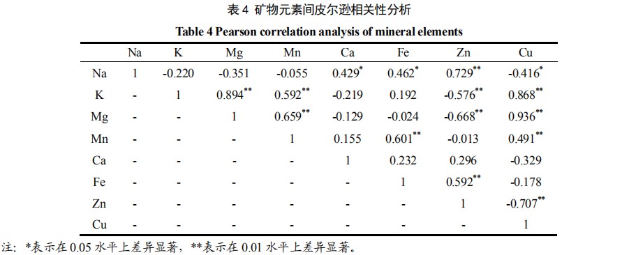 由于不同品种不同产地的柑橘品中矿物元素差异较大,故本试验采用微波消解ICP-MS 法测定了四个省份 9 个不同地区的柑橘样品中的 Na、K、Mg、Mn、Ca、Fe、Zn、Cu 8 种矿物元素,结合相关性分析、主成分分析和聚类分析对不同品种不同产地柑橘中矿物元素进行分析评价,探讨其相似性和差性,为柑橘样品产地真实性判别、种属真实性判别提供基础数据。
