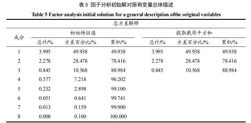 采用SPSS 25.0 主成分分析法,将数据标准化处理后,做因子分析,得到主成分的方差贡献表,根据软件给出的成分矩阵表,求出不同变量相应的主成分特征向量,特征向量和标准化数据的乘积即为变量的主成分负荷量,则不同样品的主成分得分可得。采用 SPSS 25.0 聚类分析法,将数据标准化处理后,采用系统聚类分析中沃德法得聚类谱系图。