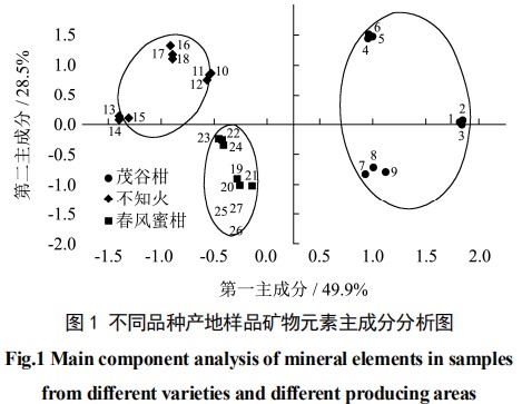 以各样品第一主成分和第二主成分得分做主成分分析散点图(如图 1),从主成分分析散点图中可以明显看出,三种不同品种的柑橘在第一和第二主成分上能够明显的区别开,这说明不同品种之间矿物元素差异明显;同一品种不同产地来源样品在主成分分析散点图中也能明显的分开,这说明矿物元素有一定的地域差异性,其中茂谷柑样品在散点图上扩散程度较大,说明茂谷柑样品的地域差异性比不知火和春见蜜柑更加明显。不知火和春见蜜柑在第一主成分上差异显著小于与茂谷柑的差异,这可能是不知火和春见蜜柑的亲缘关系相对较近导致的,这进一步说明了品种是导致矿物元素差异的主要因素。