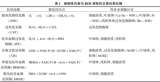 植物抗氧化酶主要种类及其催化的反应、所在亚细胞区室如表1所示。 SOD、CAT 和 APX3种酶广泛存在于植物细胞内,它们通过直接清除ROS以调控ROS水平,并把ROS 转换成活性较低和毒性更小的有害物质。 它们因为直接与ROS反应,所以被看作是细胞内ROS的传感器。