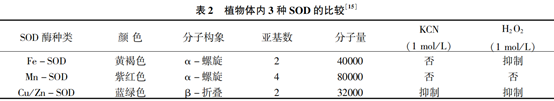 SOD 是一类广泛存在于植物细胞内且容易被ROS诱导的金属酶。 在干旱胁迫下,SOD 作为抗氧化的第一道防线主要通过清除超氧阴离子自由基以减少哈伯-韦斯反应生成更活跃的羟基自由基的风险。 SOD 催化的歧化反应比自发的反应速度要快10000 倍。 SOD 根据金属离子的不同可以分为 3种:Cu/Zn -SOD、Mn -SOD 和 Fe -SOD,它们的生化特征如表 2 所示。 当干旱胁迫诱导 ROS 增加时, SOD 的活性和含量也随之增加。 李萍等对不同品种的蚕豆做了干旱胁迫试验,结果表明:SOD 活 性随着干旱胁迫的增强呈现出先升后降的趋势,且抗旱品种的 SOD 活性增加程度大于敏感品种。