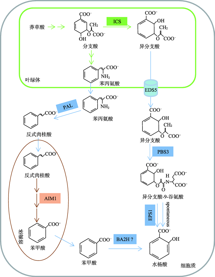 在叶绿体中,分支酸(chorismic acid, CA ) 首先在异分支酸合酶 (ICS1) 的催化下形成异分支酸(ISC),异分支酸生成后只需两种蛋白即可生成SA,分别为EDS5和PBS3。EDS5的功能是把异分支酸从质体转运到细胞质。PBS3是一种氨基转移酶,在它的催化作用下,异分支酸和谷氨酸生成异分支酸-谷氨酸加合物(ISC-9-Glu),后者非常不稳定,可自发分解生成SA。因此,PBS3是植物SA生物合成途径中缺少的关键酶。